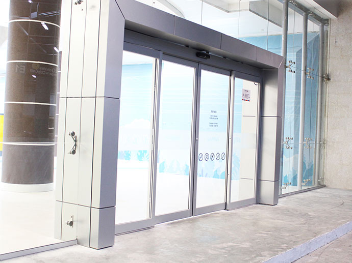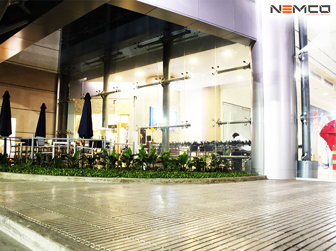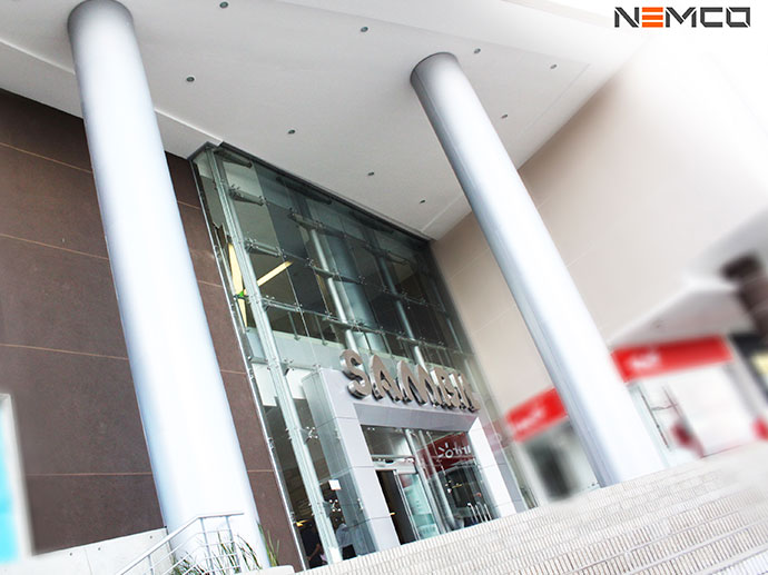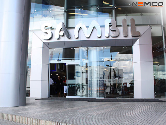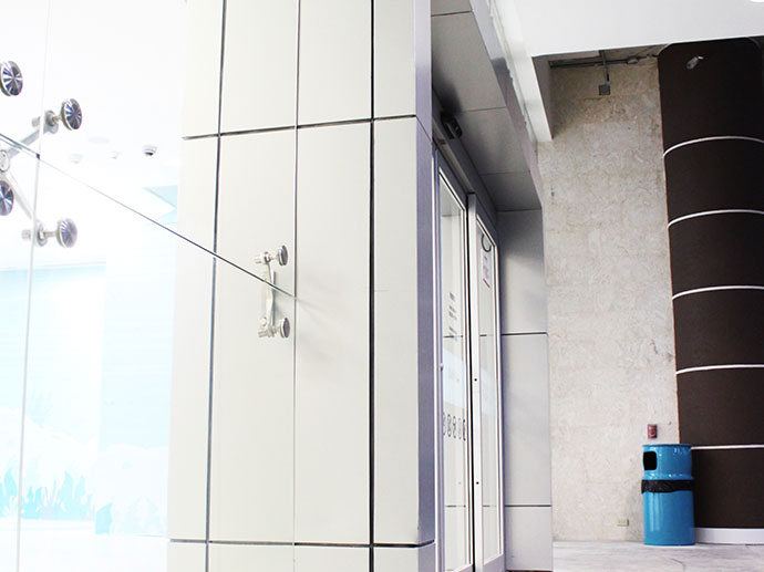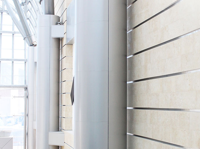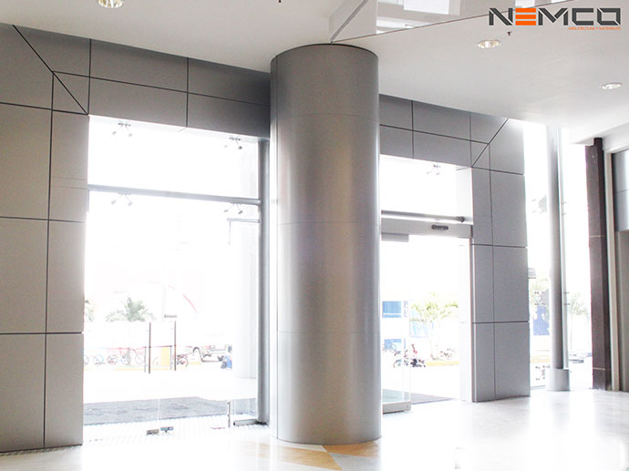 Nuestra participación en este proyecto abarcó todos los revestimientos en ACM (Material de Aluminio Compuesto). Esto está comprendido por: Revestimiento de Columnas Redondas en Entradas Principales, Zocálos en Columnas Redondas de Pasillo General, Pórticos de las seis puertas hacia el interior de la plaza.