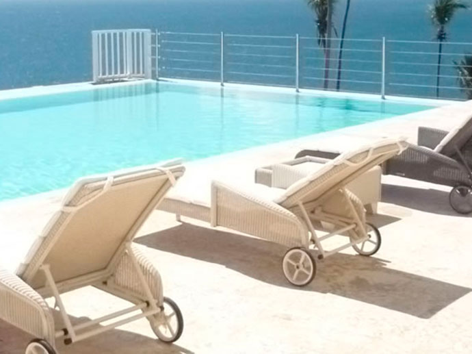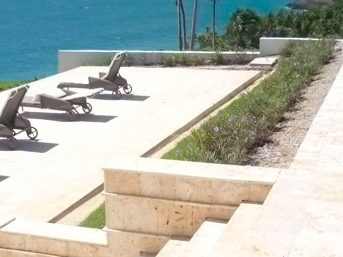 Techados en Tejas Gravilladas (Azules) en edificio principal y en palapas en playa. Decks de coralinas en diversas.